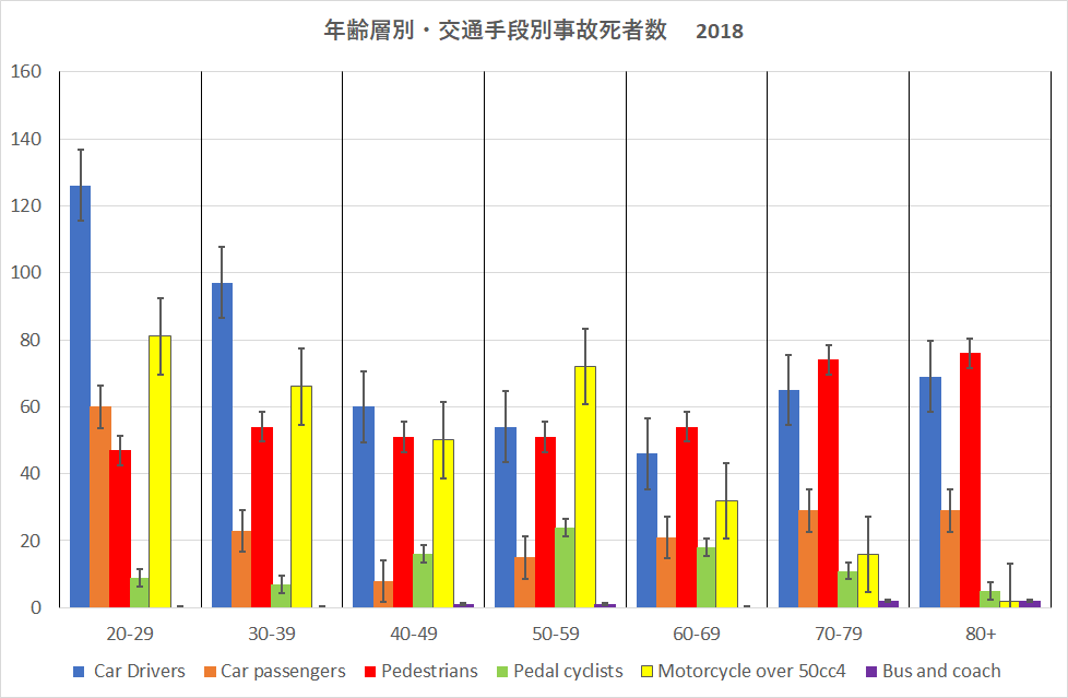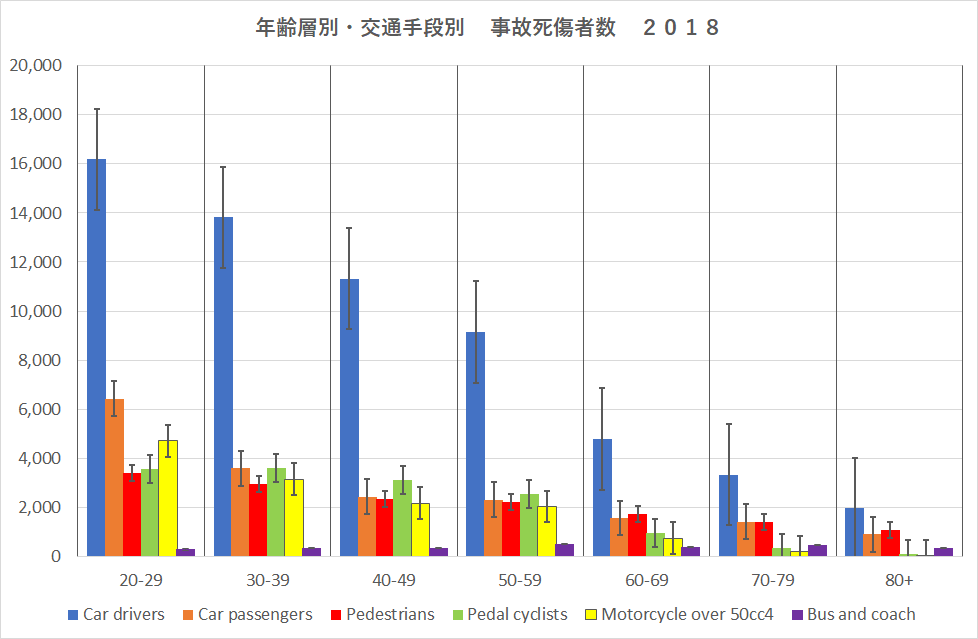下図は2018年におけるイギリスの事故死傷者数を表したもので、エラーバーは標準偏差である。何れの交通手段でも死傷事故者数はほぼ年齢とともに減少していることが分かる。