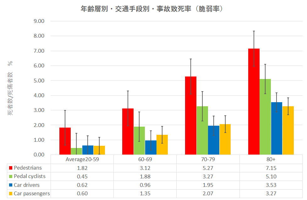 下のグラフは致死率(死者数÷死傷者数=脆弱率)について年齢層別に比べたもので、致死率は20歳~59歳の平均に比べ60歳以上で何れの交通手段でも増加していることが分かる。歩行や自転車は致死率が高く、それに比べ乗用車では低い。乗用車利用では、運転者・同乗者の何れでも致死率はほぼ変わらなく最も安全な交通手段といえる。