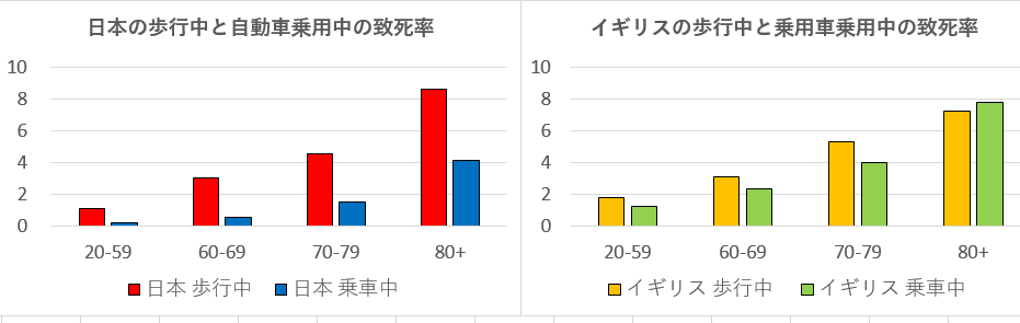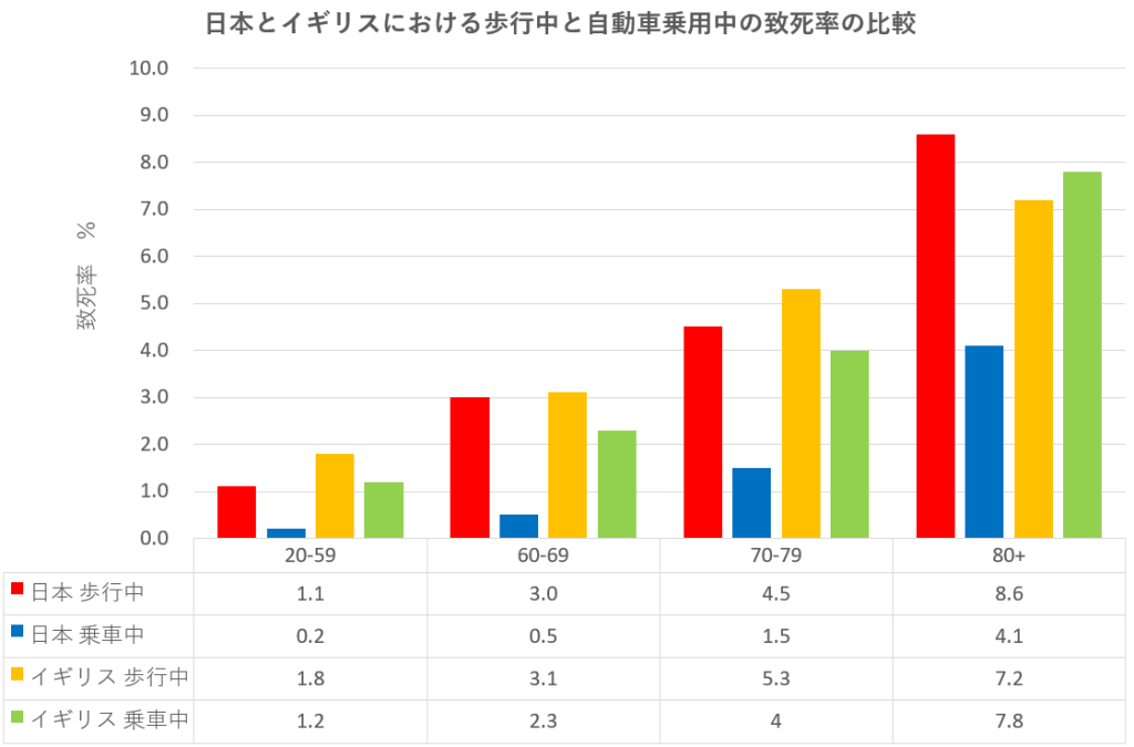 結果は、日本の場合、歩行者の致死率は自動車乗用中の致死率に比べ常に大きく、イギリスの2倍ほど、イギリスでは、いずれの年齢層でも歩行者と乗用車乗用中にそれほど大きな違いは無い。