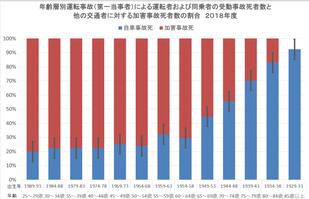 69歳以下の運転者は自分を含む乗用中の死者率は20%~50%以下、他の交通利用者に対する加害率は最大で80%。それに対し70歳以上の高齢者層では年齢とともに自損事故率が上がり、85歳以上では殆どが自分自身の事故死の要因と見ることが出来る。