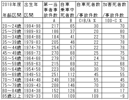 高齢運転者は加齢とともに自身の死亡事故が多くなるが加害事故は少ない 85歳以上では殆ど自損事故死である