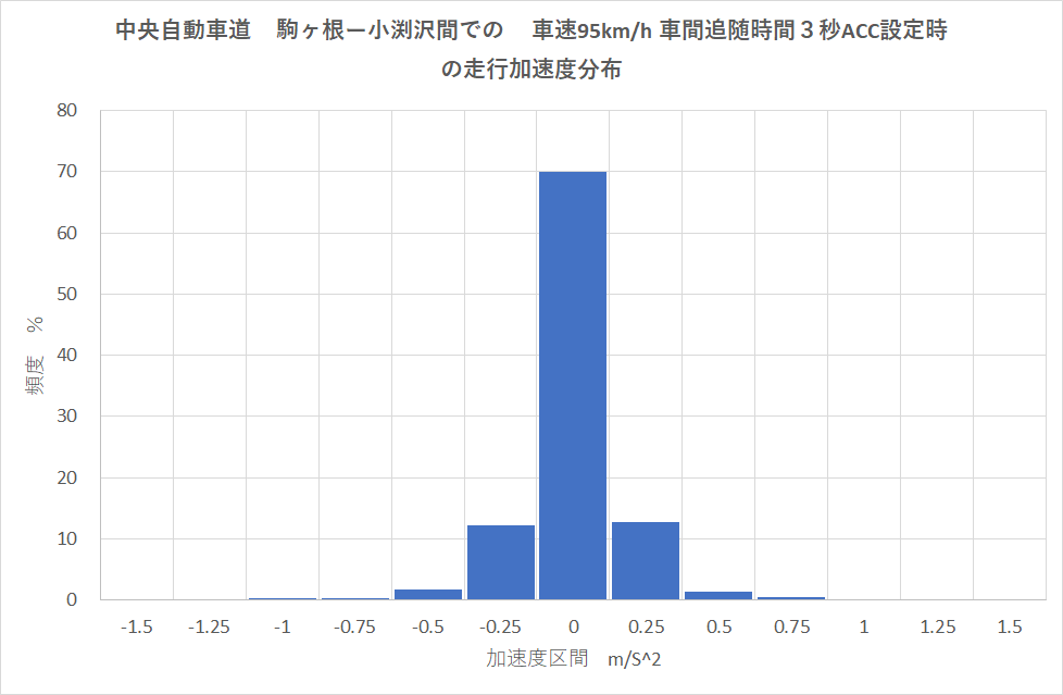 下の度数分布グラフは、走行方向の加速度(m/s^2)の相対頻度%で、正が加速,負が減速の場合で、加速度±1(m/s^2)に95%が収まっている。