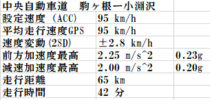 走行は中央自動車道 標識速度80km/h区間で行った。クルーズ設定速度はこの区間での乗用車の実勢速度に近い95km/hに設定した。法定速度違反かも知れないが法定速度では、トラック等に車間距不足で接近して追随されることが多いので危険を避けるため、概略の乗用車の実勢速度に合わせた。下のグラフはこの時の走行速度と自動スロットル・ポジション記録、また青色の線はアクセルペダルの踏み込み率ですべて0%、この期間すべてアクセスペダルフリーで走行していたことが分かる。ブレーキペダル踏み込み記録は無いがこの間ブレーキにもタッチしていない。走行中減速しているのは追い越し車線走行中トラックに割り込まれ自動的に減速となったものである。スロットル記録のスパイク状の上昇は、先行車が道を開け設定速度復帰のため自動的に解放されたもので、アクセルペダルの踏み込み込みの結果ではない。この間ステアリング以外はすべて自動制御で走行した。