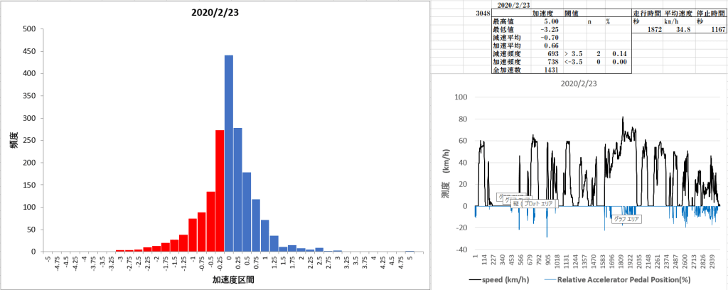 その一例として私の運転中の速度、加速度データを分析してみた。データはGPSの毎秒毎の速度記録から算出した。