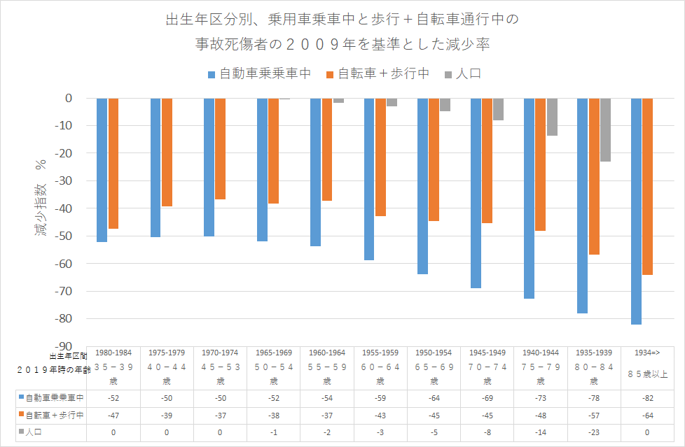 歩行・自転車事故の減少率に関しては、人口減から見てこのグラフの年齢範囲全体ではでは、ほぼ一定と見ていいだろう。