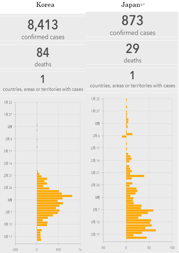上のグラフは、中国と日本の感染確認者数の日変化である。注意して見ていただきたいのは、横軸(人数)のスケールの違いである。例えば上図では中国の最大メモリは2万人、対して日本では100人である。
