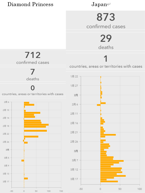 時系列的に見ると国内での感染はクルーズ船感染者の拡散のように見えるがこれは無いだろう。日本での感染者拡大は別の原因と思われる。
