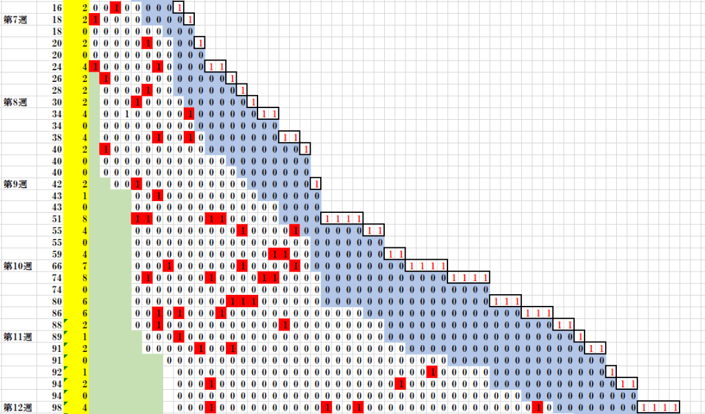 一人の未発病感染確認者が2週間に1名の割合で他の人に感染を広げて行く模擬状況の一部。各行右端の赤字は新たに感染させた人数、青色塗つぶし部分は感染しているが他に感染をさせるに至っていない期間、赤塗りつぶしはそれぞれ一人に感染を移した場合。黄緑色は回復してウィルスを他に感染させる恐れの無くなった部分である。