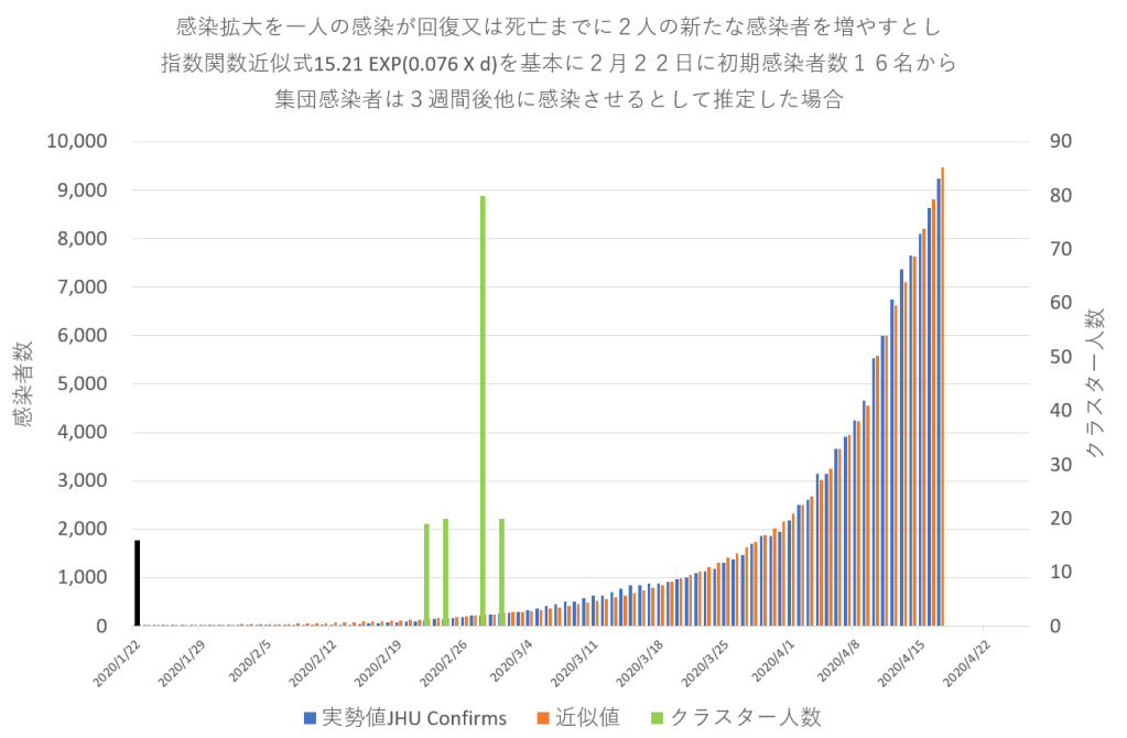 日本の累積感染確認者数の2月25日から4月12日間で求めた対数近似式を基本に用い、1月22日に16名の感染者から始まった感染拡張の原因を後ろ向き推定をしてみた。これは、一人の確認感染者が感染可能期間中に2名の新しい感染者を生む確率となる。