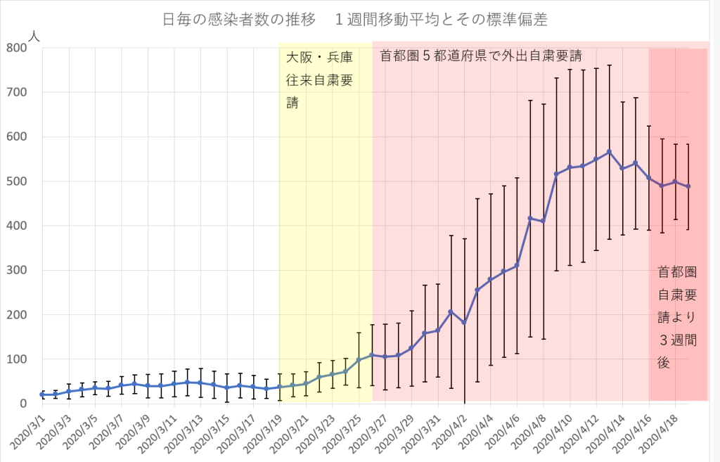 1週間の移動平均とその標準偏差をグラフにしました。データはJHU