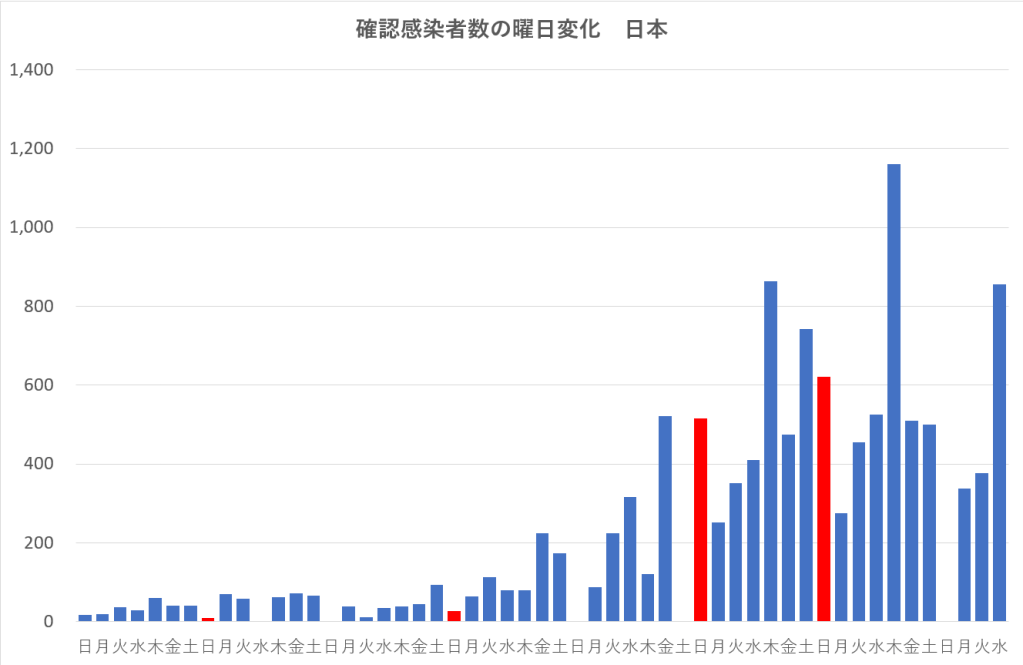 COVID-19 確認感染者報告数と週日との関係 日本の無責任な検査体制の証拠