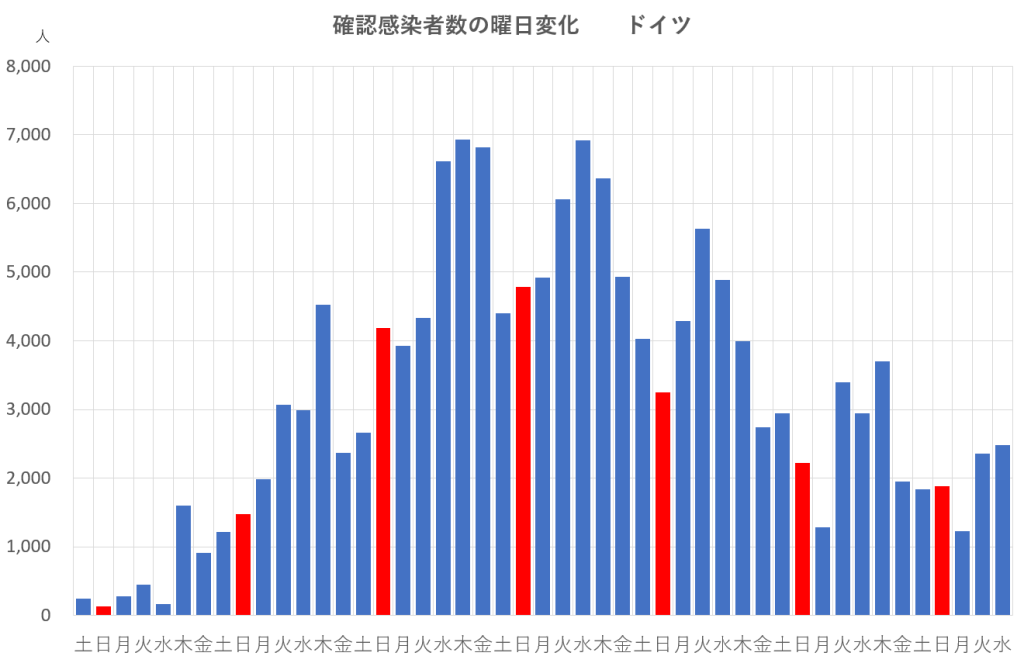 下のドイツの場合、確かに日曜日を挟んで前後の3日間は感染者数が少ないが、これは検査数が少ないのか、市民の社会活動の週日変化のせいかは分からない。いずれにしても、健康管理機関が脳天気に土日休んでいることの証拠はない。