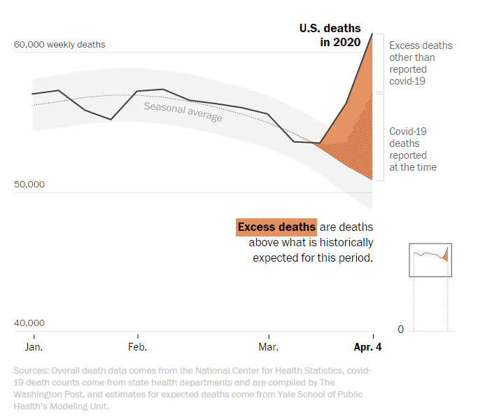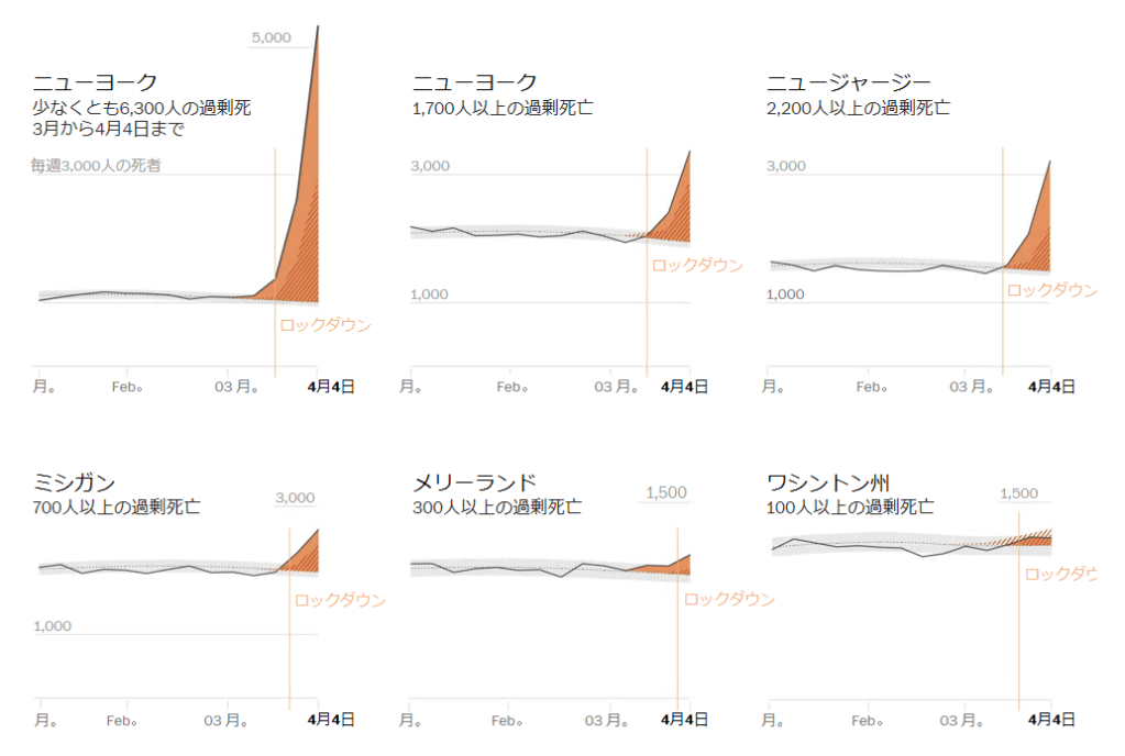 世界で最大のCOVID-19の感染者・死亡者を発表したアメリカ。それでも感染確認死亡者の発表数は、4月4日時点で、平年の季節変動病死者の統計変動値より増加した総死亡者数の半分、あとの半分は未確定の死者で、いずれも今年は異常増加をしめしている。原因がこの統計時点では不明になっている死亡者全員が隠された感染死亡者とは限らない。医療崩壊により、心疾患や糖尿病、誤嚥肺炎など十分な救急医療が受けれれなかったために平年より死亡者が増加したことは十分考えられる。