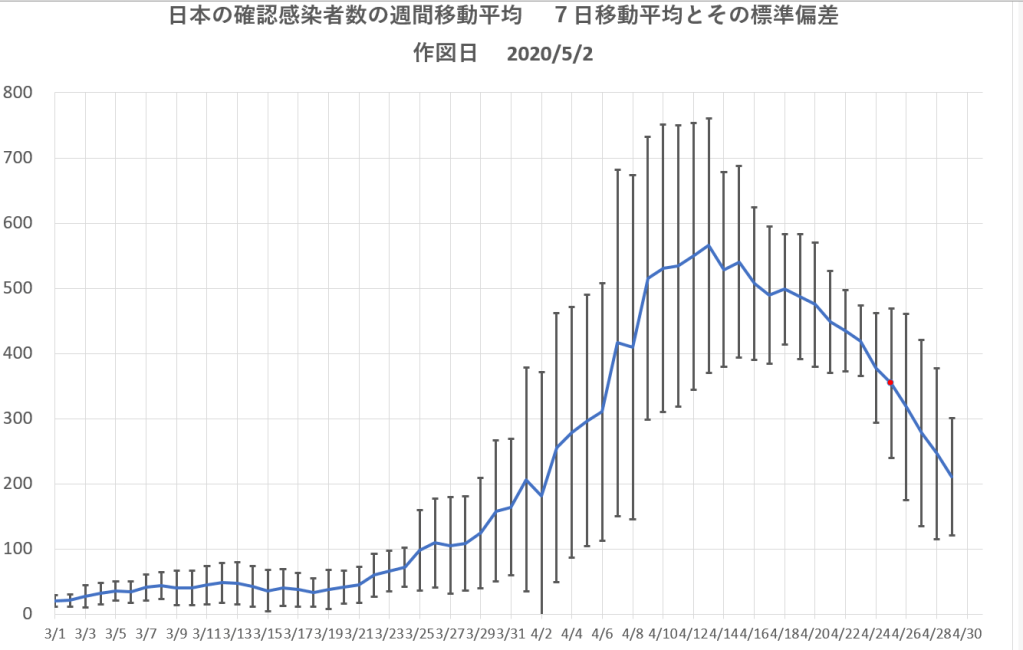 新型コロナウィルス確認感染者、確認死亡者 7日(週間)移動平均。 COVID-19日感染者推移 外出規制の効果。