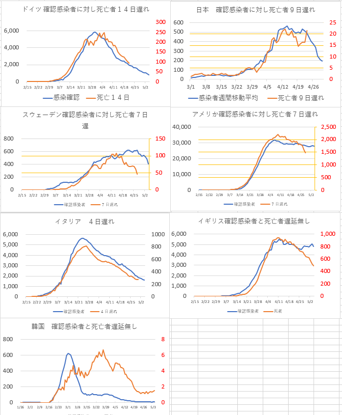その値は国によってまちまちで、ドイツでは14日(2週間)、日本は9日間、スウェーデン、アメリカでは7日(1週間)、イタリアでは4日、イギリスは遅延無し、韓国では早期にPCR検査を高率に行い隔離したために死亡者が極端に少なくこの関係は見られない。