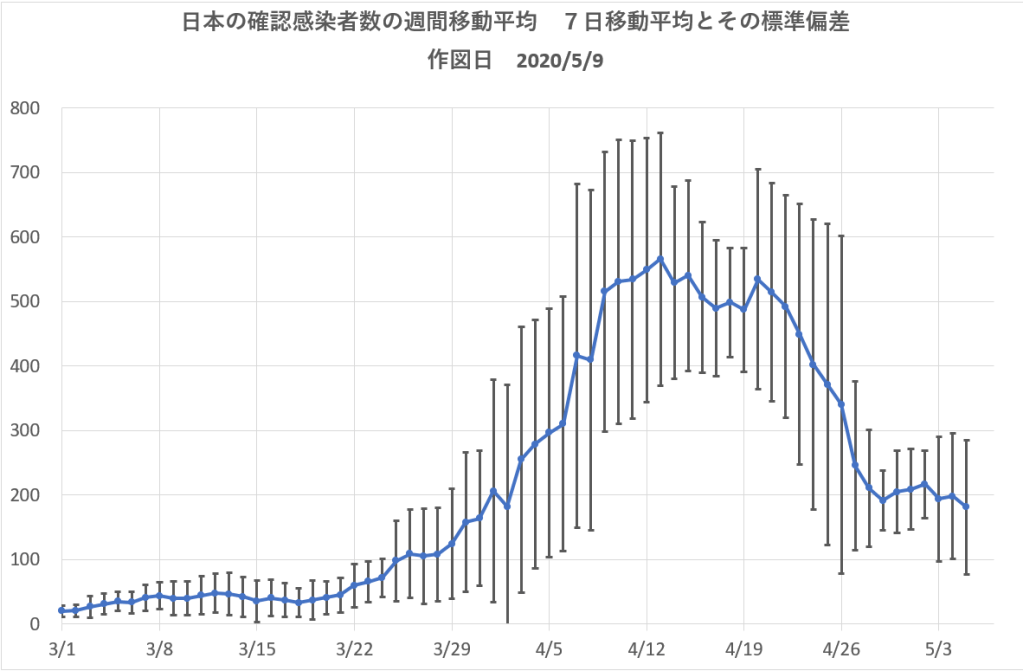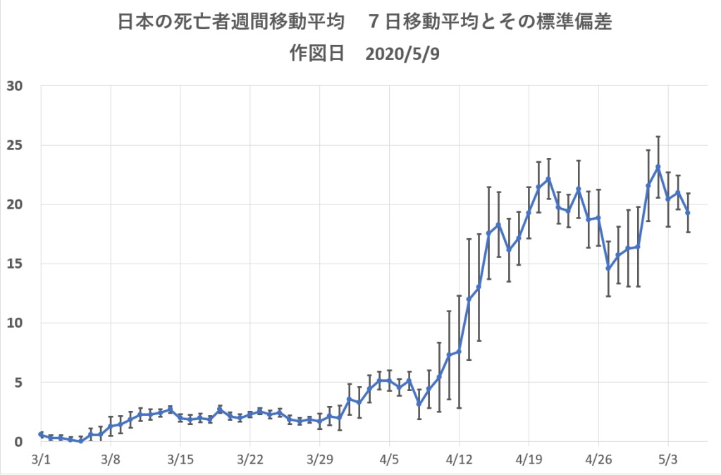 確認感染者数の下降は本物の様だ。ひとまず安心か? 死者はの発生は約10日ほどおくれて現れるはず。下降が続けば本物といえよう。