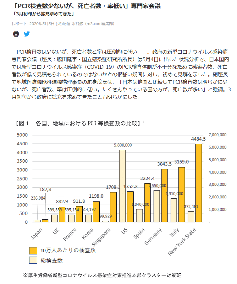 ちょっと古いがとぼけた報告記事。「日本は他国と比較しPCR検査数は明らかに少ないが、死亡者数、死亡率は圧倒的に少ない・・・」 これがほんとである証拠が示されていない。偉い人たちが言っているから正しいというのであろうか? 死亡者の検視でCOVID-9の感染確認をもれなくやっている証拠を示さない限り、これも検査漏れ(あるいは故意にしない)の疑いは晴れない。これは制度的に早急には無理だと云いたいだろうが、日本の死亡者は99%火葬であり、死後遅くとも1週間以内に火葬にしている。しかも火葬場は地方公共団体の施設管理下にありその記録がないとは言えない。これの過去の季節統計と、今年の3,4月の火葬数の過剰数の有無を調べ、これが平年と大差なければ(欧米では過剰死亡数50%増の国も)、COVID-19関連の死亡者が少ない明白な証拠となる。