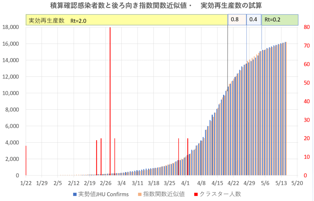 近似方法は、感染と判定された感染者が新たに他の人に感染を及ぼす期間を4週間と仮定し、その間に何人の新たな感染者を生むかを仮定し、指数関数近似したものである。最初黄色の期間は、一人の感染者が2名の新たな感染者を生産するとした場合で、続いて0.8人、0.4人、そして5人で一人の割合(0.2、薄緑)に相当する近似値でシミュレートしたものである。