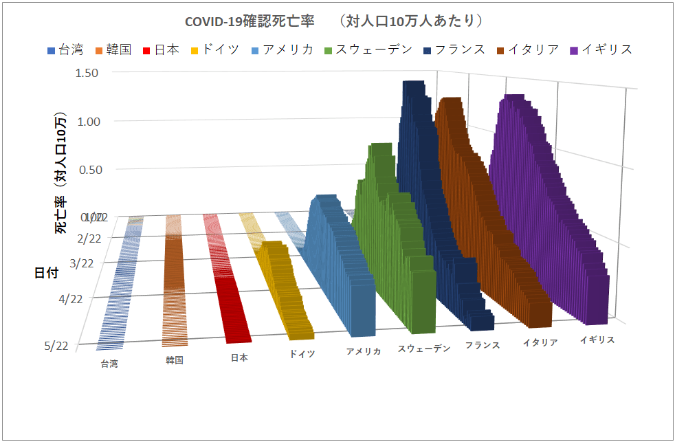 際立った特徴は、われわれ東アジアの国に比べ、欧米ではどの国も死亡者の急上昇が見られた。ニュースでは、アメリカは最悪のような印象を与えているが、ヨーロッパに比べ国としての人口が多い為で人口当たりにで見るとそれほど多くない。ヨーロッパでの特徴は、ドイツは確実に少なく、収束も早いといえる。メルケルさんの科学的な証拠に基づいた合理的な政策が功を奏したともいえる。