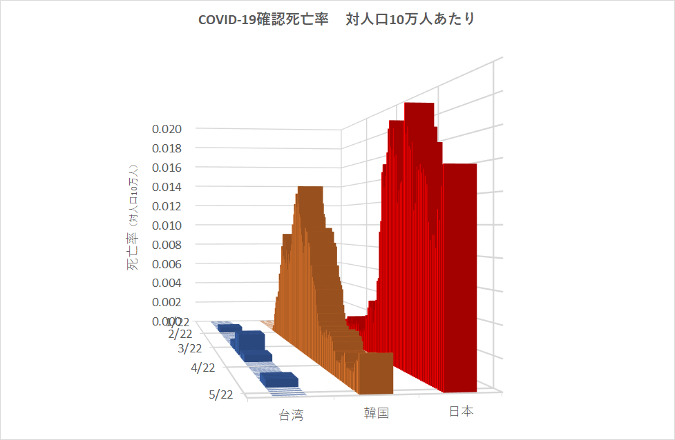 疫学的な感染症対策をいち早く実行した台湾は極端に少なく、全期間を通じて殆どCOVID-19の死者を出していないことが分かる。韓国と日本とを比べると、日本の死亡者の収束が遅いことが気にかかる。