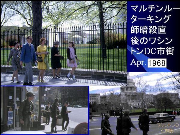 トランプ政権では2度目の争乱。1968年私はこの時ワシントンDCに学会で滞在していた。その時撮った組み写真で、夜間は外出禁止令が出た。昼間は外出出来たが至る所に軍用車、議事堂の周りには軍隊のパトロール。しかし緊迫した雰囲気は無く、田舎からの旅行中と見られる3世代の家族が散策するるホワイトハウス前の通り。下左は酒屋を守っている2人の兵士。夜間外出期間中はホテルのレストランでも酒類は禁止。