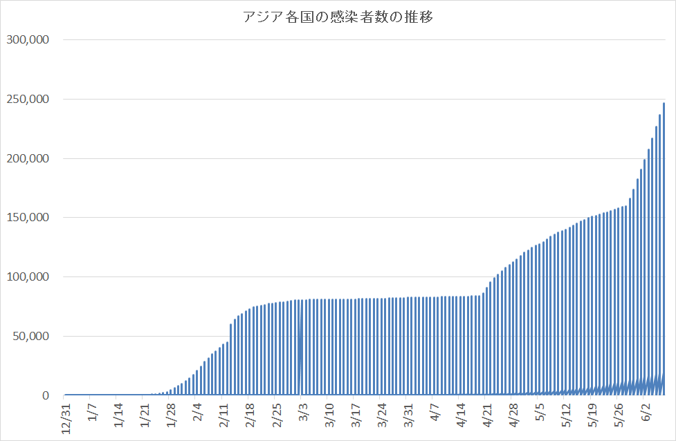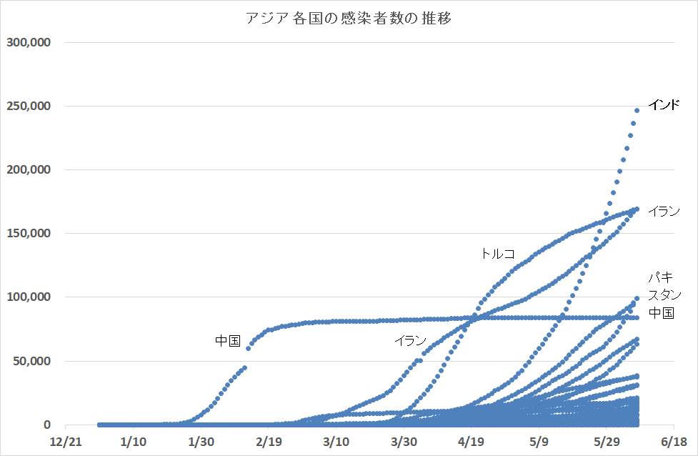 アジアでは、中国が1月末から感染爆発が見られたが1か月後には感染者増は封じられた。4月半ばの曲線状の増加は、中国やヨーロッパからの既感染地域からの移動者と見られる既感染者からのトルコにおける感染によるもの。ほぼ封じ込めた国とインド、イランなど感染増加中の国々に分かれる。