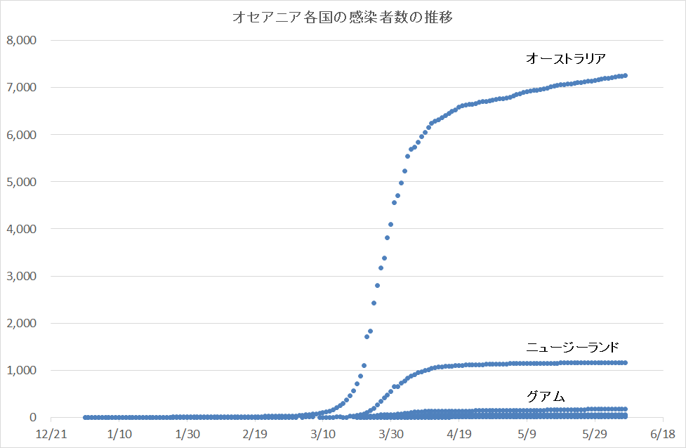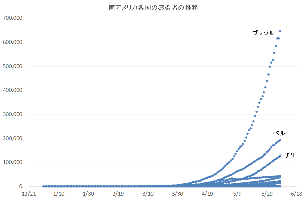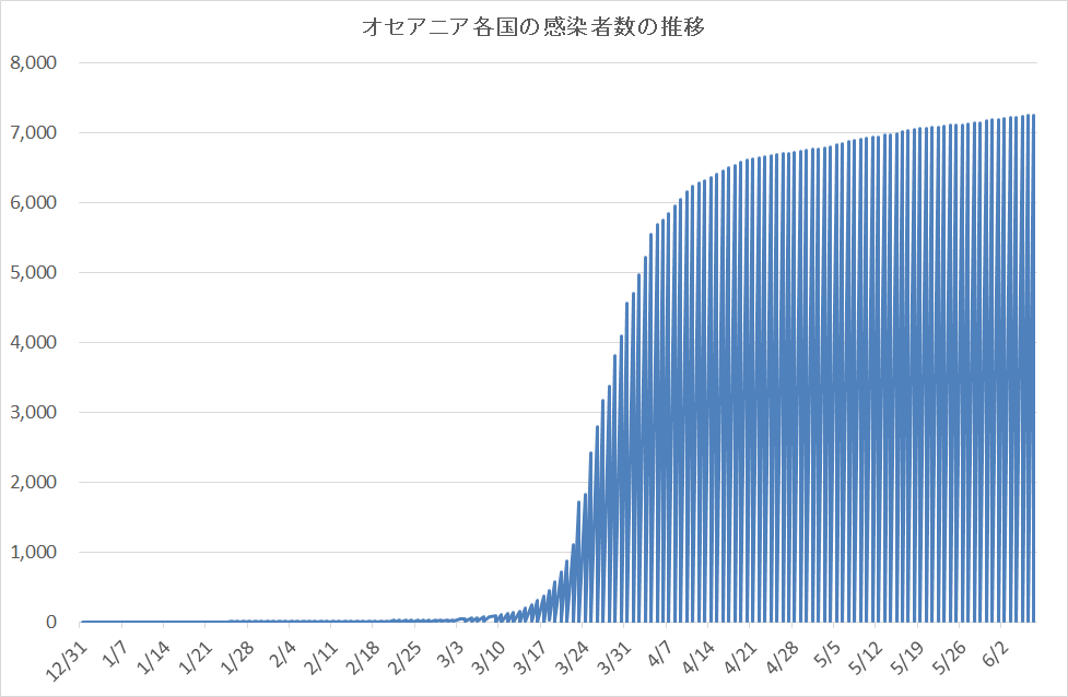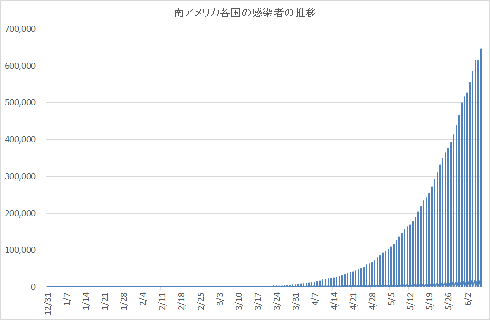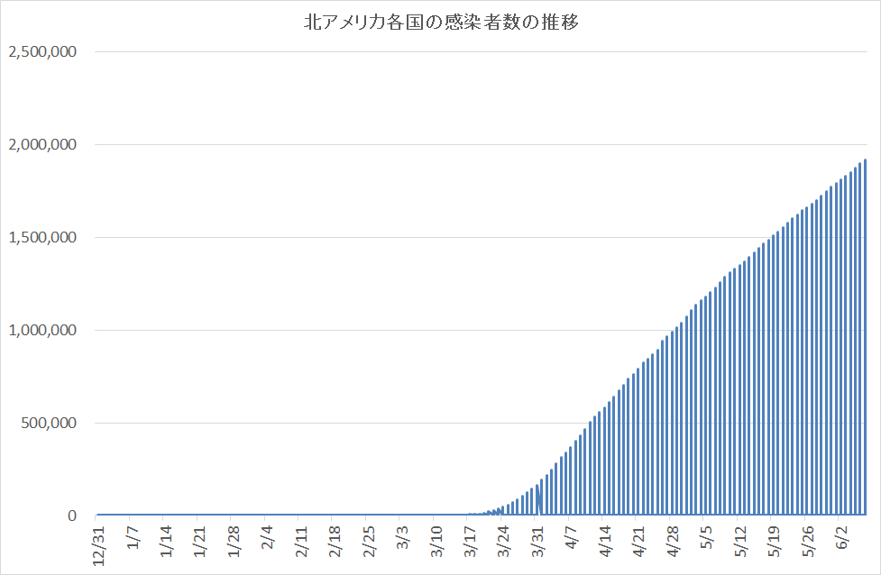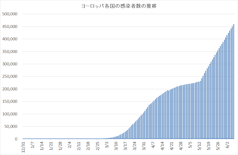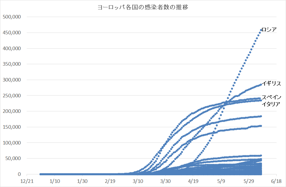 爆発的増加の始まりは3月初め、5月に入って主な国はほぼ感染を食い止めたがロシアは感染爆発中と見られる。