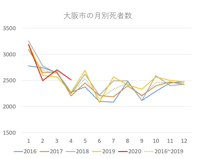 以上過年度の死亡者数の季節変化グラフの同月変動値に比べ2020年度の月死亡者数は両市とも増加しているが、誤差の範囲を超えて明確に超過死亡を記録しているとは言えない。