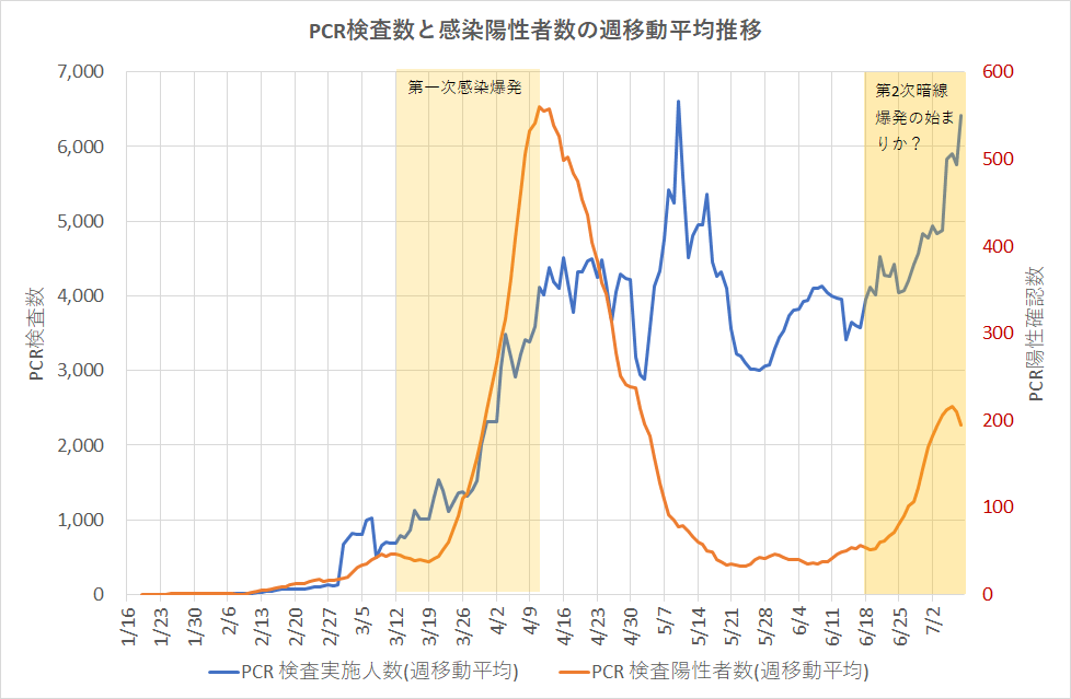 日毎のPCR検査数と陽性者数については、週間規則変動が見られるので(7日)移動平均を用いて示したのが下のグラフである。陽性者数は右スケールである。