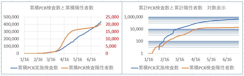 PCR検査の積算数と積算感染確認者数の日毎の増加の様子を見ると、日本ではPCR検査累計数はほぼ一定率で増加しているが4月半ば以降陽性者数の増加は見られない。言い換えれば、これは、日本の場合PCR検査が少ないから確認感染者が少ないのではない一つの証拠である。