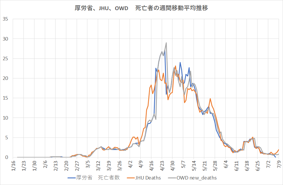 先ず、死亡者数の日間発生数について調べてみた。日変化は週日効果が大きいので一週間の移動平均の中央日で変動グラフを描いたのが下のグラフである。三つのデータベースの間では大勢は一致しているものの、この程度の差が見られる。世界の標準時差の関係で日付の判定が難しいのが分かる。