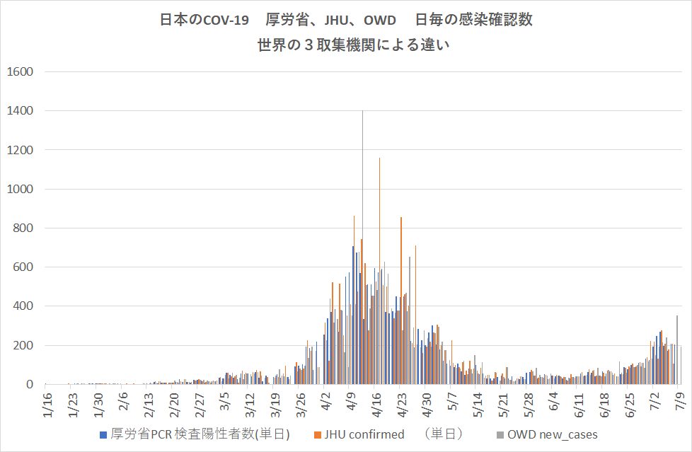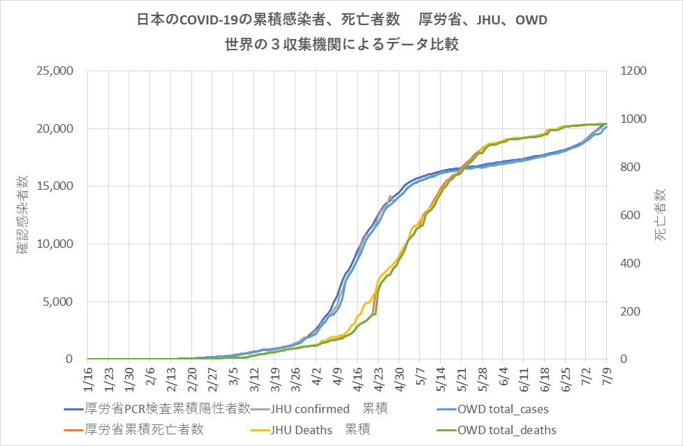 発生当初からの累積数については、期間の前半では不一致も見られるが、当然のことながら三機関の値は日程が進むにつれ一致は良くなっている。