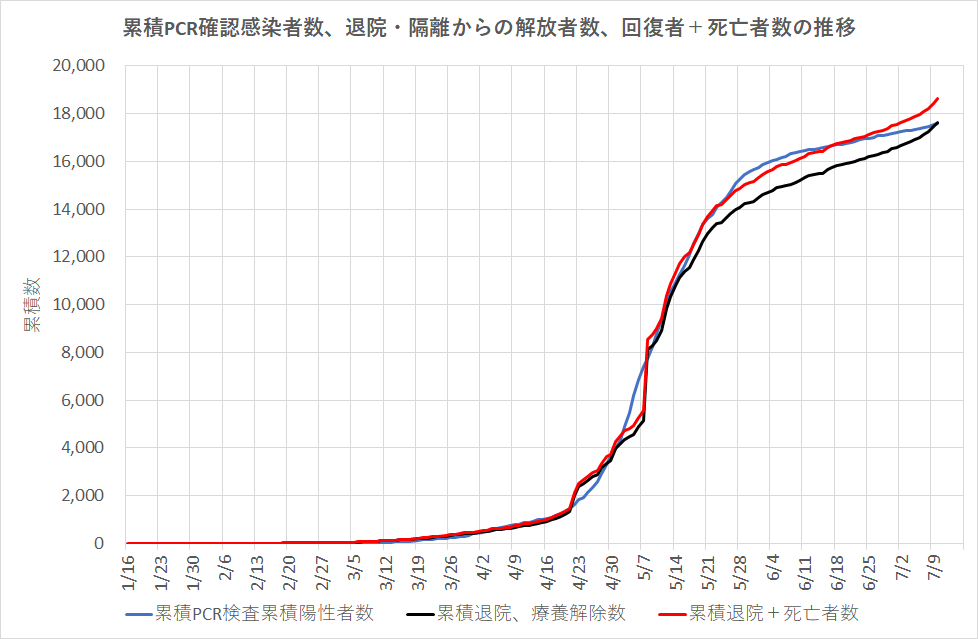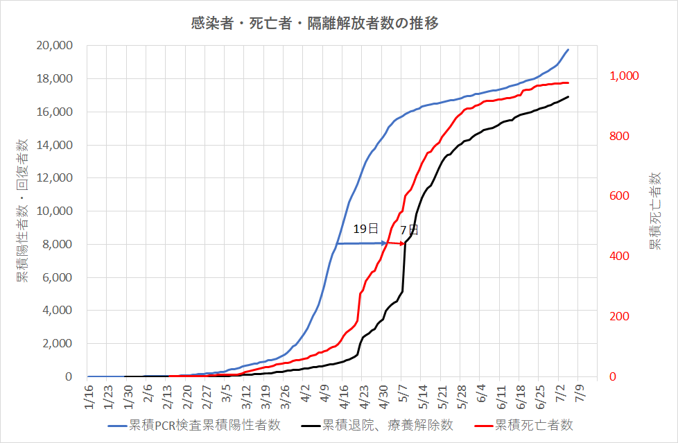 下のグラフは、回復者の日付曲線に重ねるよう、確認感染者、回復退院者・隔離からの解放者、それに加えた死亡者、すなわち医療を受けた総数を上のグラフに示した矢印の日差で重ねたもので、よく一致している事が分かる。ただし、7月に入ってからは気にかかる傾向が?