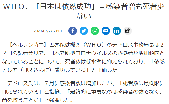WHOにやっとおほめ頂いた 日本のCOVID-19医療、 死者を防ぐことに成功。 明日から日本のメディア 論調の風向きが変わるかも
