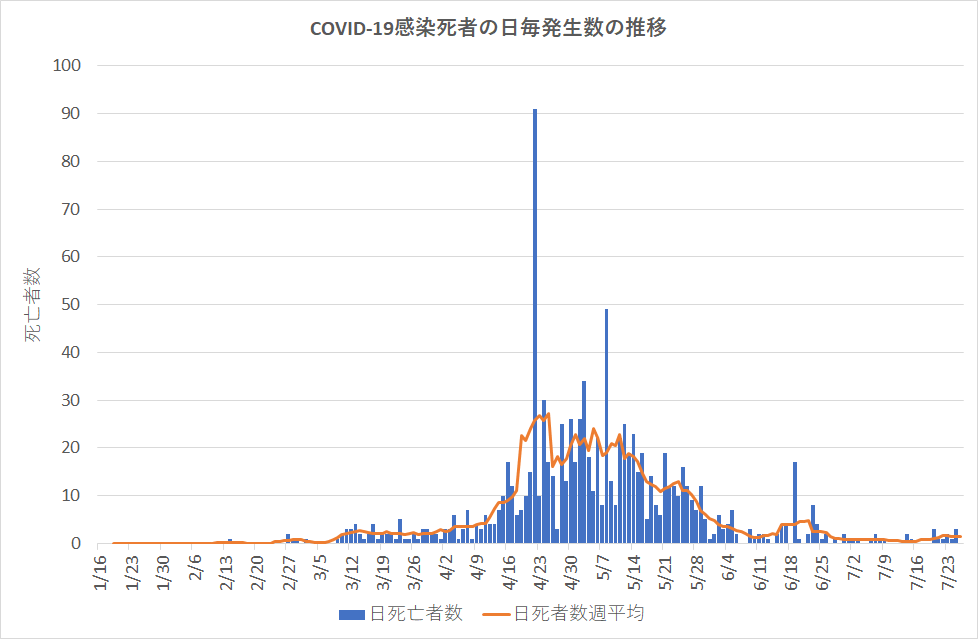 死亡者の日毎の発生数で見たものが下のグラフで、単日の変動はかなり大きく、メディアニュースの種にされていた。赤線は週間(7日)移動平均である。