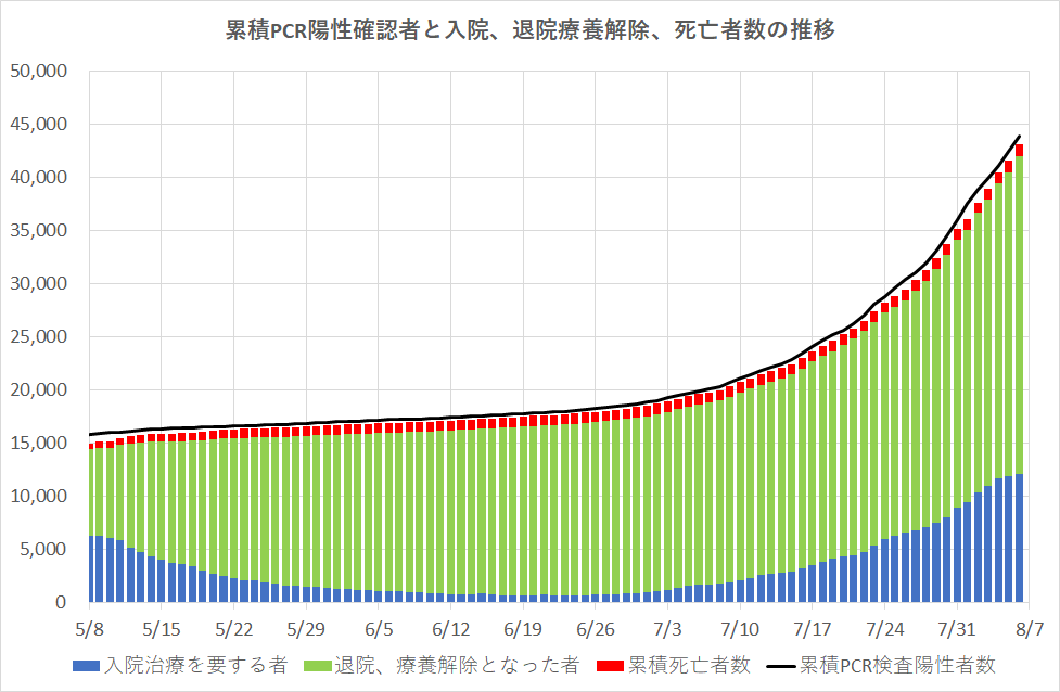 これを見ると、7初期まではPCR確認感染者数と推定感染者とはよく一致している。公表されている死亡者数が正確にCOVID-19発病死亡者とすれば、この期間のPCR検査で陽性と確認された者はほぼ全員が発症初期の(活性)新型コロナウィルス感染者であったとみることが出来る。この期間、日本のPCR検査は帰国者や感染発病の恐れの濃厚な者に限られていた。