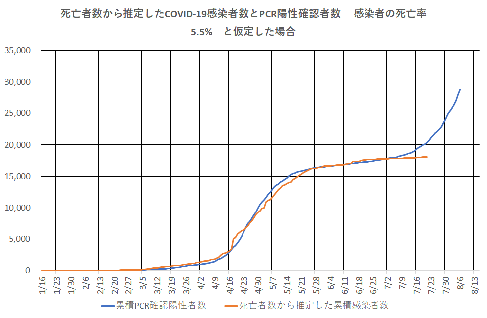 下のグラフはPCR検査により陽性と確認された累積人数と、COVID-19(新型ウィルス)が原因で死亡したと報告された人数から逆向推定(感染者の死亡率5.5%)した16日前の推定COVID-19感染者数とを重ね合わせたものである。