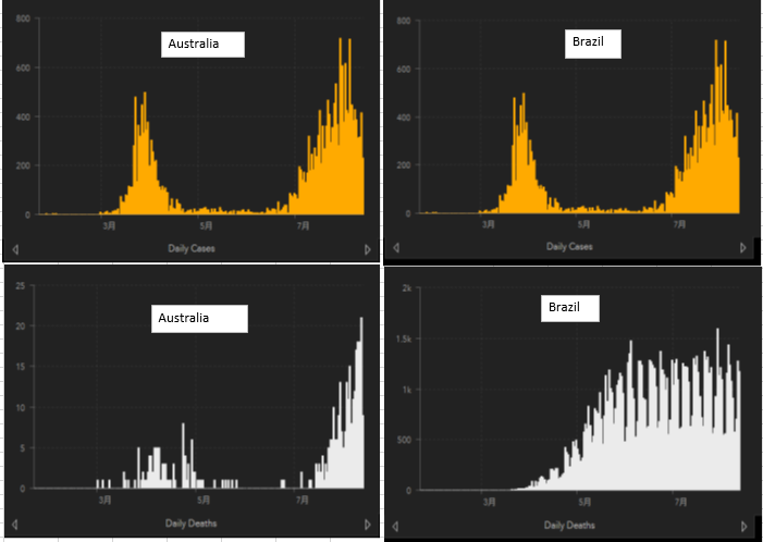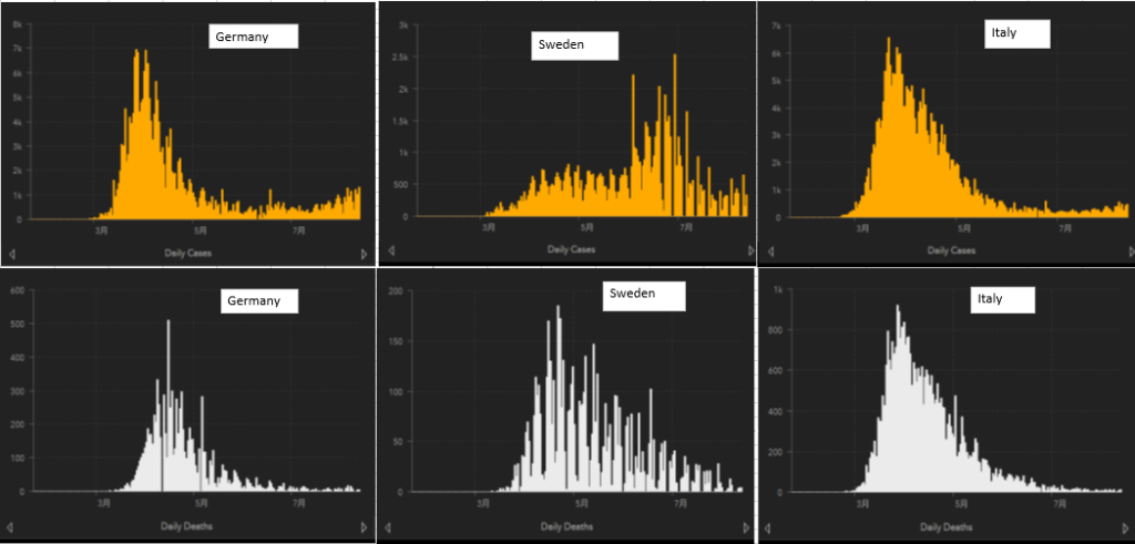 何れにしても今回のパンデミックは不明なことが多く、また政治政策や社会習慣の違いからか、国や地域による形態の変化が大きい。その一例として感染者数と死亡者数の日変動についてジョーンズ・ホプキンス大学が公表しているグラフで見てみた。https://www.arcgis.com/apps/opsdashboard/index.html#/bda7594740fd40299423467b48e9ecf6