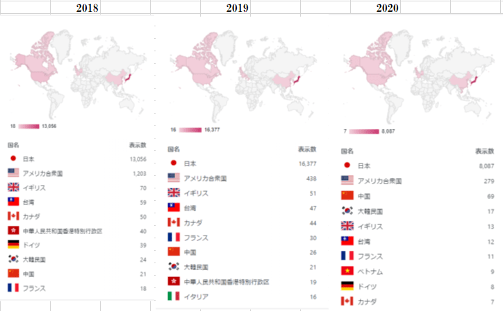 2012年から見ると、アメリカは9年間すべてで際立って多い。他の国では、年毎に順位は入れ替わるが、2017年より中国の表示数が急に増え始め、本年(2020)にはアメリカに次ぐ2位となっている。ほぼ毎年見ていただいている国々は、香港、マカオ特別区、また台湾。他の国では、韓国、イギリス、ドイツ、フランス、カナダ。不思議なことに大国ロシアは2015年に5位に記録されていたがそれ以後10位までには現れていない。南半球ではオーストラリアとニュージーランドが記録されている。
