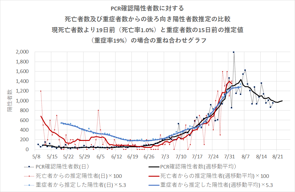 これらの日間のずれを移動して重ねたものが上のグラフである。7月1ヶ月間の期間では、なり良い一致をしていると見るべきだろう。この期間死亡者数は陽性確認者数の1%程度であった。