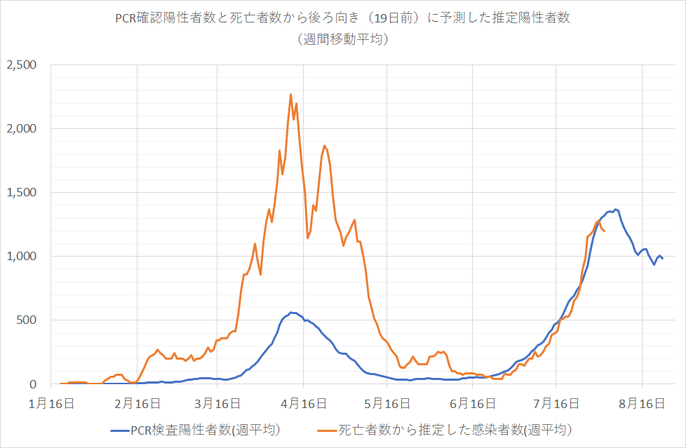 したがって、COVID-19感染全期間にわたって死亡者が感染者の1%と仮定してCONVID-19感染者数を推定したものが下のグラフの橙色線である。青色は公表されたPCR検査の陽性者数で何れも週移動平均で示した。