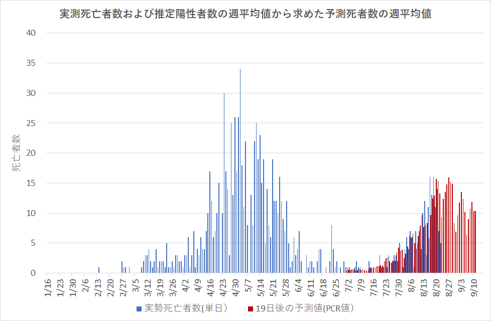 下のグラフは、公表された全期間の日当たりの死亡者数(青色棒)である。7月以降は、確認陽者数の1%が19日後に死亡するとして試算(赤棒)重ね合わせたものである。8月22日以後はこの仮定での予測値である。