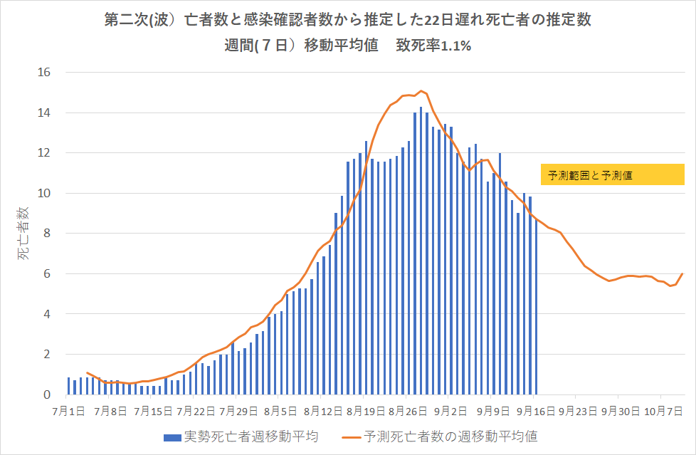 厚生省のデータを用いて、第二次(波)のPCR監査によるCOVID-19感染確認者数から推定した予測死者数と実際に発生した日死亡者数の週間(7日)移動平均値を比較した。