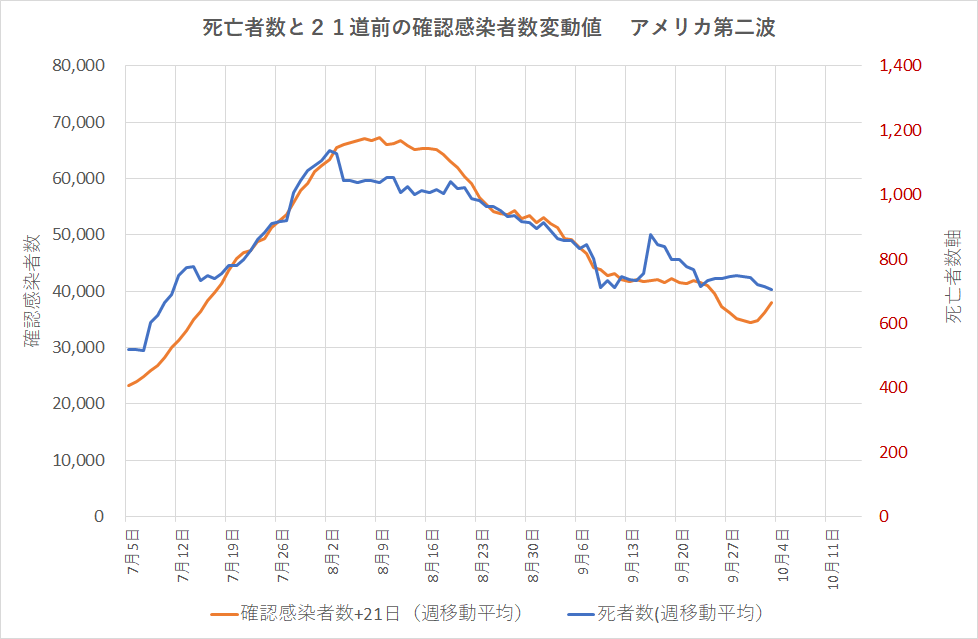 アメリカのCOVID-19 感染者確認と死亡者の関係 第二波では死亡は感染の21日遅れで発生し致死率1.5~2.5%