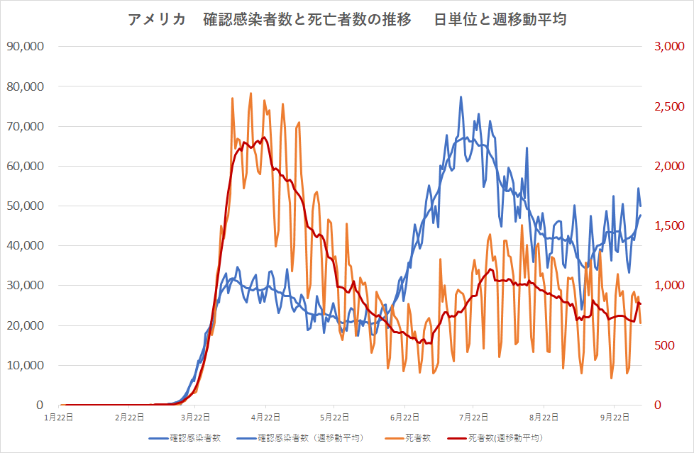 下図はアメリカの確認感染者数と死亡者数の日発生数について週移動平均(7日)を表したものである。データはジョーンズ・ホプキンス大学。