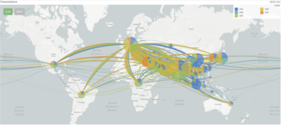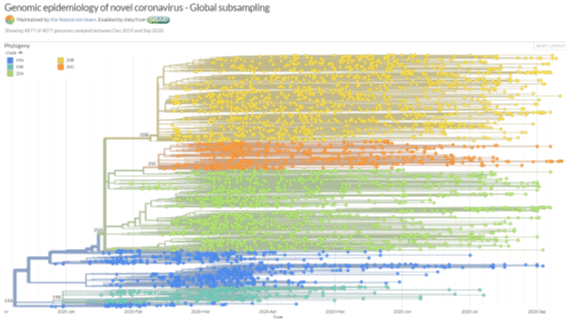 疫学者は、新型コロナウィルス(SARS-CoV-2)遺伝子系統のランダムな突然変異を研究して、上図の様な系統図を表しています。