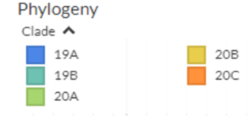これと、下の二つの画像での色分け密度を見る限り、アメリカではヨーロッパに多い遺伝子系統群20D,20Cウィルスが伝搬し蔓延した様に見える。