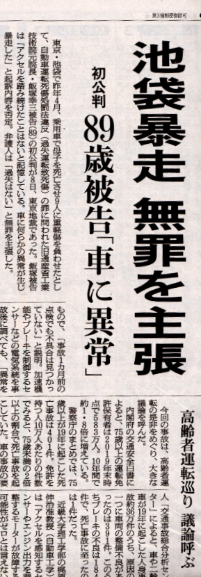 この新聞記事によると、歩行中母子の被害者の家族の裁判傍聴記事も載せているが、心情は分かるが、むなしさではなく、また運転者の厳罰では事故の根本的な解決でもなく、再発も防げない。訴訟による正確な事故原因調査により、場合によっては自動車製造会社の責任である可能性も出て来、賠償責任も生ずる可能性をメディアは指摘すべきであろう。