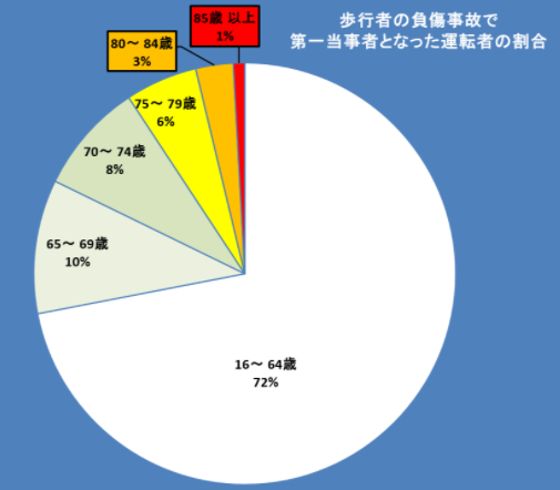 事故件数の72%は64歳以下の運転者で占められ、75歳以上の高齢運転者は10%である。80歳以上では4%。