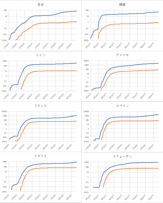 下のグラフは、青色の線が累積確認感染者数、赤色が累積死亡者数。対数グラフであるから各線の上下の間隔は確認感染者数に対する死亡率を表す。間隔が大きいほど致死率が小さいことがを示す。